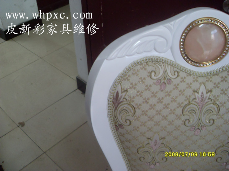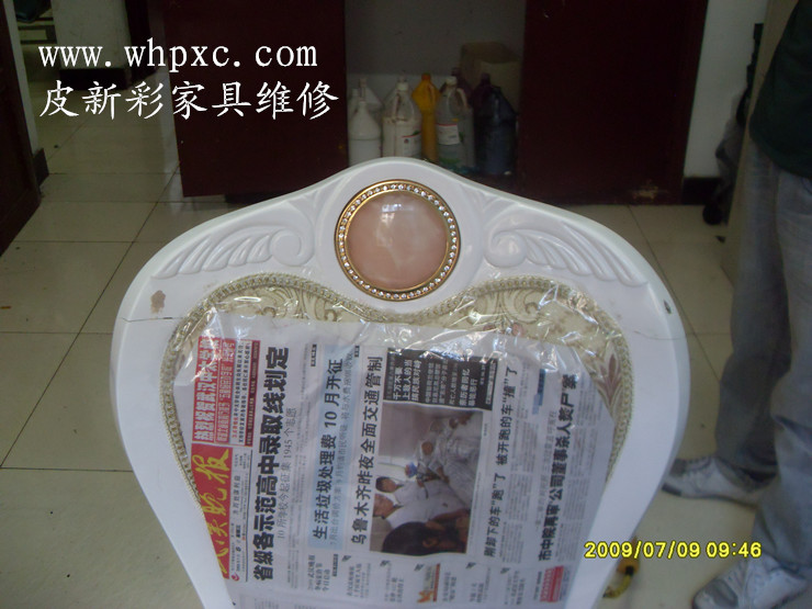 白色烤漆家具維修,這把椅子木材很硬摔裂了,需要先上膠再打丁,用進口白色自噴漆進行維修,修復(fù)好了之后完全看不出來,皮新彩家具維修電話13995508166