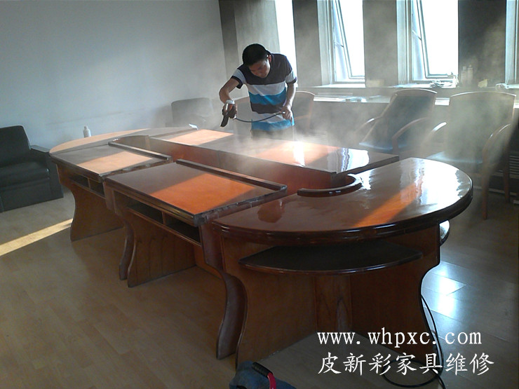 辦公家具維修,這是武漢5A甲級寫字樓,曾經(jīng)是武漢最好的寫字樓,這家具確實(shí)有點(diǎn)過時(shí),客戶要求經(jīng)濟(jì)環(huán)保,我們用水性漆給桌面做了翻新,皮新彩辦公家具維修翻新13995508166