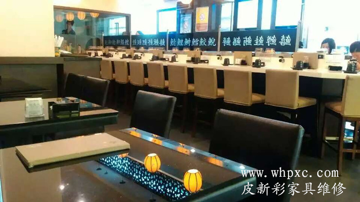 禾祿壽司日本料理餐廳,每家分店的椅子每年都由我們換面一次,保證了家具品質(zhì),換皮面比買新的要便宜80%,皮新彩餐廳家具維修熱線:13554633331