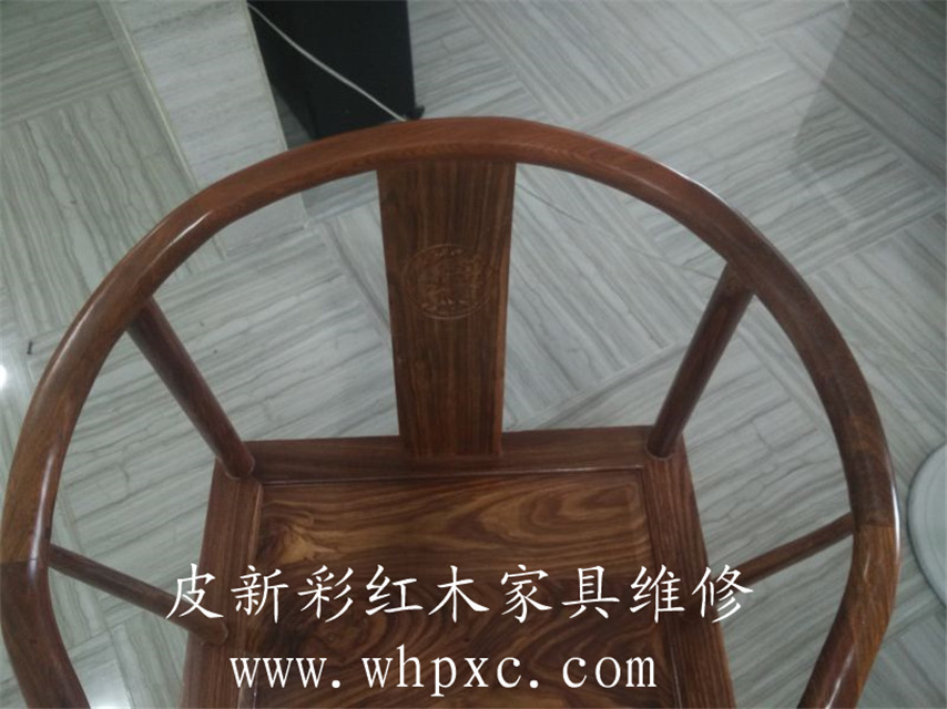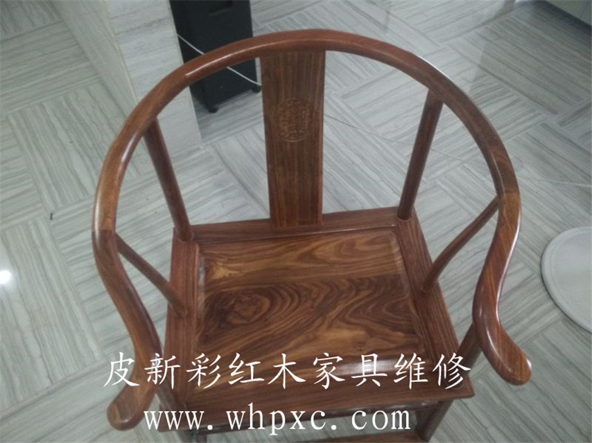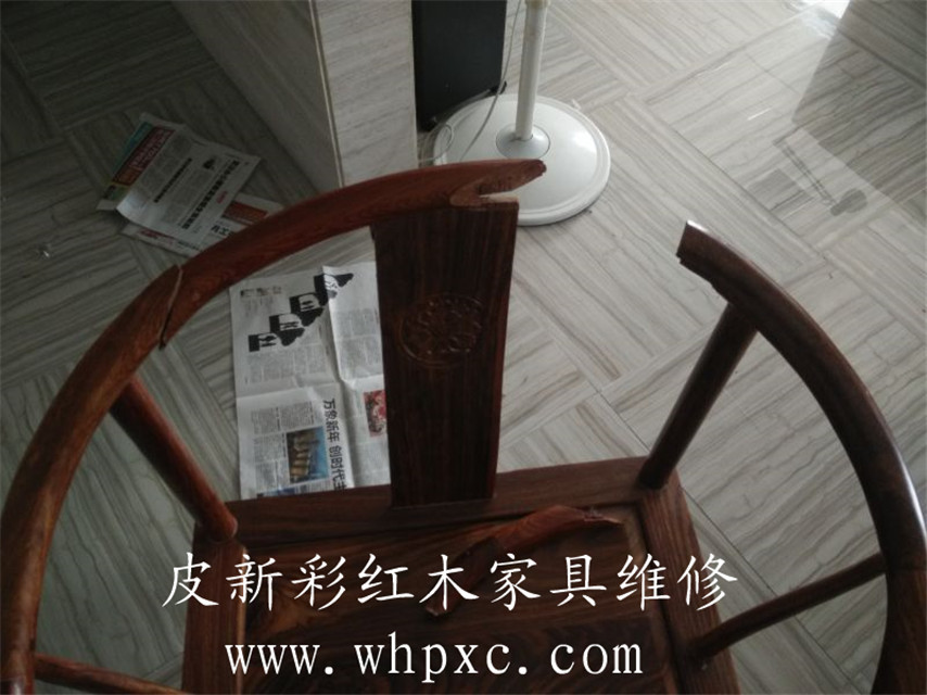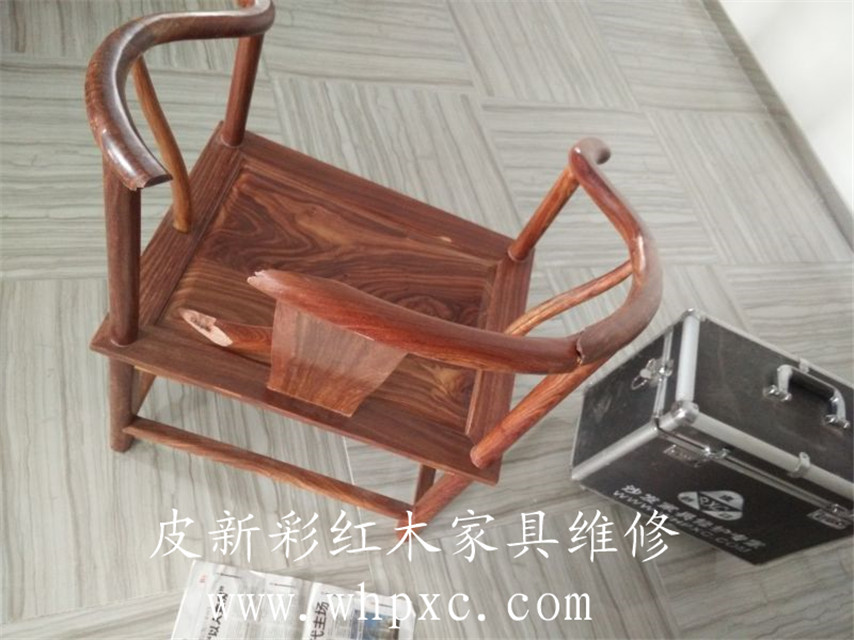 這個紅木圈椅已經(jīng)斷成3節(jié),需要先用膠固定再打丁加固,用鋸末填好縫隙,再上色描紋,修完以后又完好如初,維修費(fèi)用300元,2小時搞定,皮新彩紅木家具維修熱線:13995508166