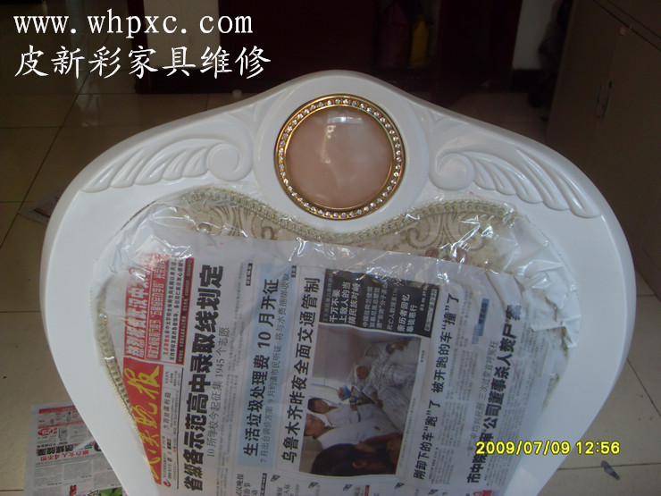 白色烤漆家具維修,這把椅子木材很硬摔裂了,需要先上膠再打丁,用進口白色自噴漆進行維修,修復(fù)好了之后完全看不出來,皮新彩家具維修電話13995508166