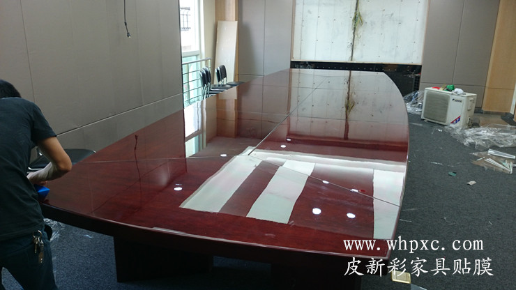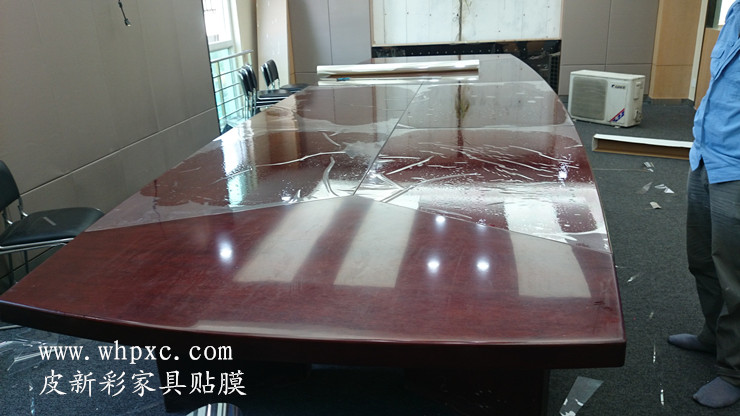 會議桌貼膜,辦公室裝修了,舊家具棄之可惜用又太舊,整個噴漆翻新污染大,周期長費用高,還是貼膜效果好又便宜又快,還沒有污染,皮新彩辦公家具貼膜電話:13995508166