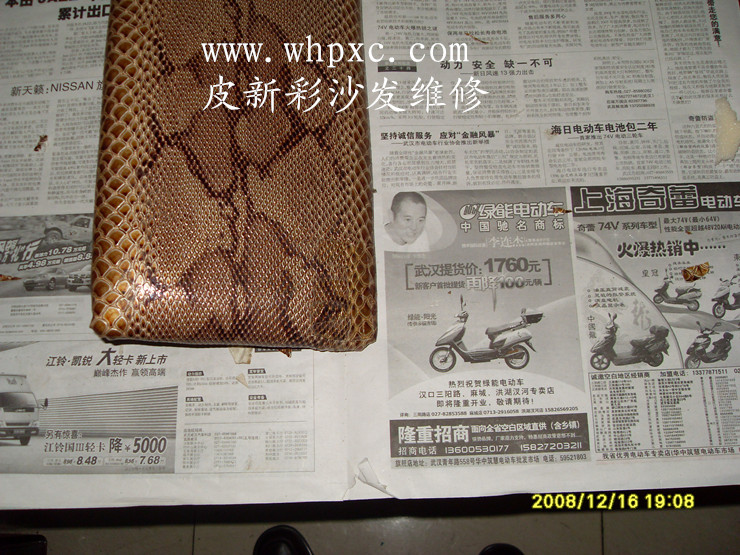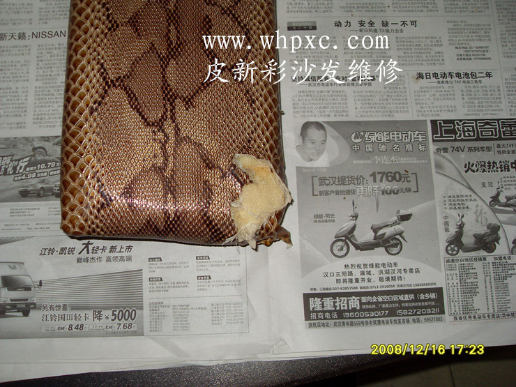 蛇皮沙發(fā)維修,這種破洞缺一塊皮子,紋路及顏色不太好做,我們需要就地取材在沙發(fā)的里面或反面剪一塊多余的皮子,再把他拼接上去,拼接傷口考驗(yàn)的是耐心和細(xì)心,拼接好了再上色修補(bǔ),皮新彩沙發(fā)維修熱線:13995508166