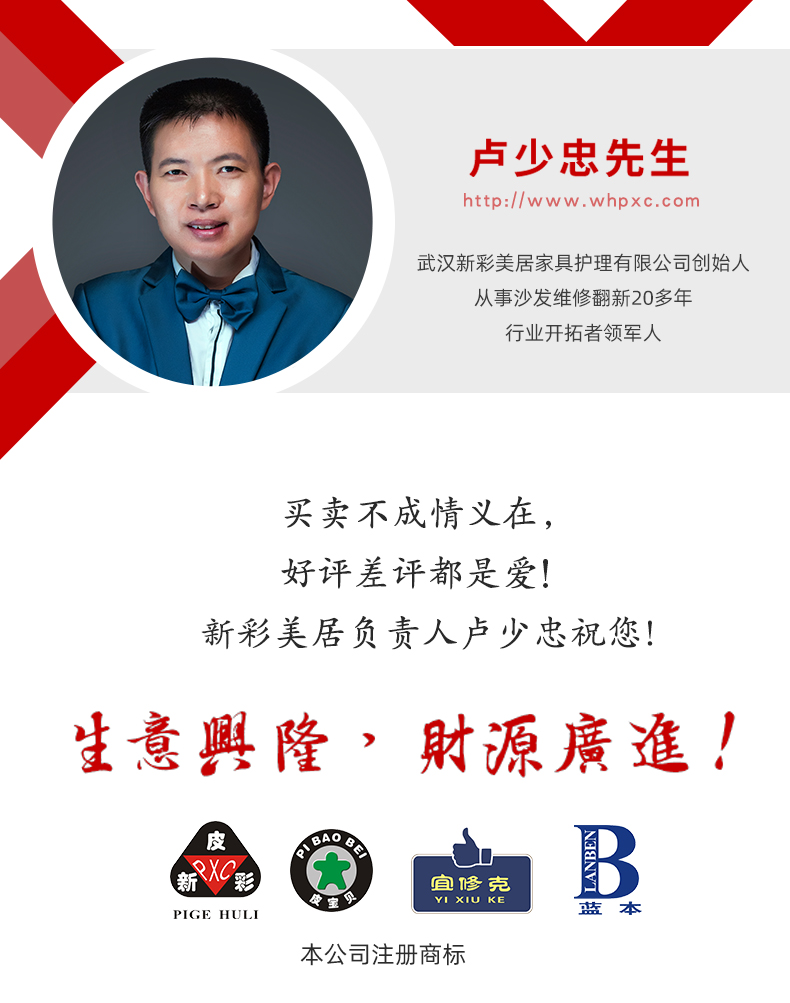 武漢皮新彩家具護理有限責任公司,2000年在武漢成立。本公司旗下有皮新彩、皮寶貝、宜修克、新涂悅色、藍本等多個品牌。專業(yè)提供皮革、沙發(fā)、家具維修翻新…